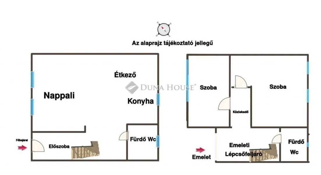 Emelet: 2 hálószoba, folyosó beépített szekrénnyel, zuhanyzós WC