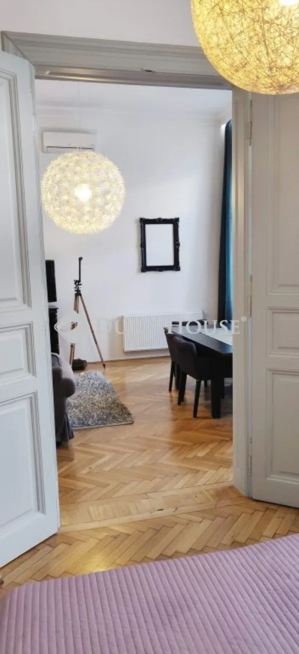 The size of the apartment is 69 sqm under the title deed, but thanks to the 4 m height, the owner has created a unique loft solution beside the two street view rooms, a quiet 12 sqm loft room with a height of 1.95 m, overlooking the courtyard, so the total usable area is 81 sqm. The two large rooms (27.5 sqm and 19.5 sqm) overlook Dohány Street, the kitchen is mechanized, a circular boiler provides heating, there is underfloor heating in the cold-tiled areas, and it is also equipped with 2 split air conditioners and alarm system.