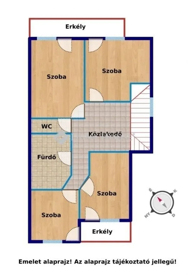 A lakás emeleti helyiségei: 4 db szoba, közlekedő, WC, fürdő.