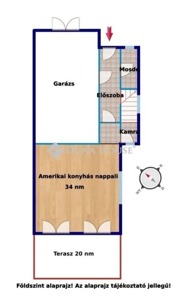 A lakás földszinti helyiségei: amerikai konyhás nappali, kamra, előszoba, mosdó, garázs, tároló.