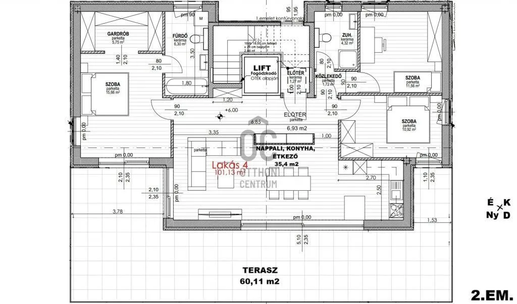 XI. Kerület SASAD KÖRZETÉBEN, CSENDES MELLÉKUTCÁBAN, SÍK, négyzet alakú, 1026 m2 telken épülő, 4 LAKÁSOS LIFTES TÁRSASHÁZBAN kínálunk eladásra, egy DNY-i TÁJOLÁSÚ, 121 m2-es (60 m2 terasz 1/3 méretének a beszámítása mellett. A terasz nélküli nettó alapterület 101 m2), 4 SZOBÁS, 2 FÜRDŐSZOBÁS, 2 DB TEREMGARÁZZSAL (+10 Mft/db), és 5,5 m2 tárolóval (+5,5 Mft) rendelkező újépítésű penthouse lakást.
