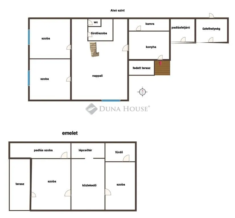 Alsó szinten : -konyha-étkező-2 nagy méretű szoba -fürdő-wc-kamra