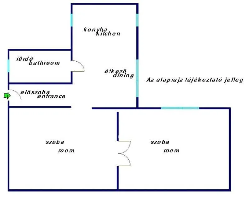 A lakás elosztása: előszoba, konyha, fürdő-WC, étkező, valamint két egymásból nyíló, nagy belmagasságú szoba.