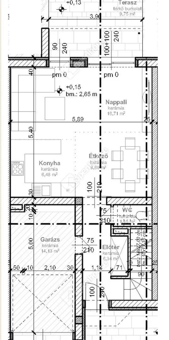 - Az alsó szinten található az egy légtérben kialakított nappali-konyha-étkező egysége, melyhez egy 10 nm - es burkolt terasz kapcsolódik