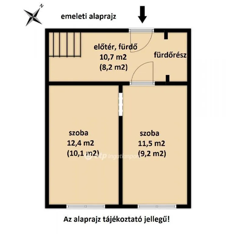 Az emeleti részen két szoba, és egy vizesblokk kapott helyet. Az emeleti rész külön bejárattal is rendelkezik, ahonnan rögtön a kertbe léphetünk.
