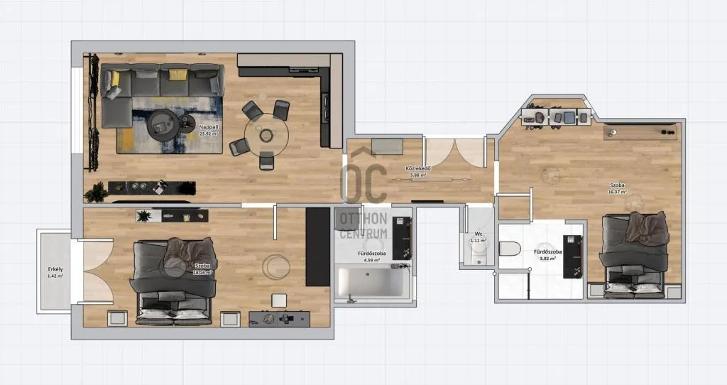 - A belsőépítész által megálmodott dizájn, az egyedi gépesített konyha, valamint az igény szerint elérhető bútorzat modern, stílusos életteret kínál.