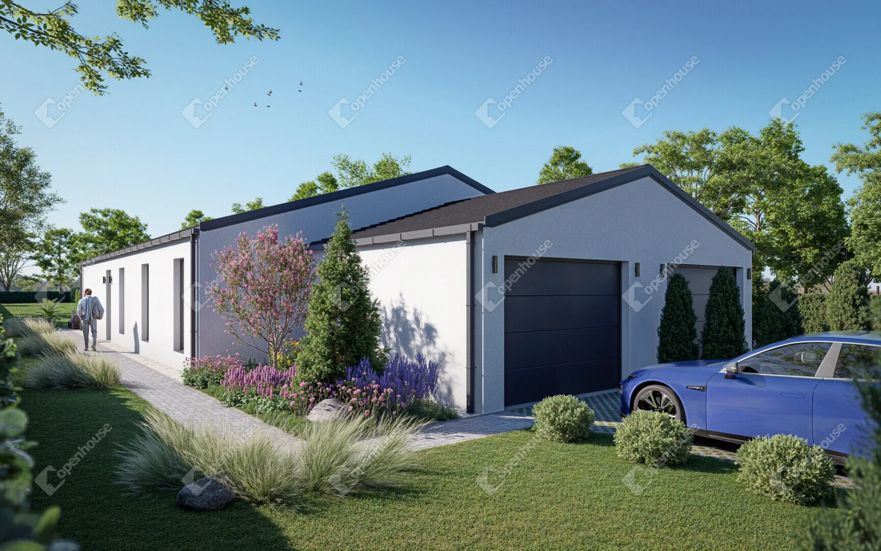 A garázs 20 m²-es, elektromos Hörmann kapuval felszerelve, kényelmes parkolást biztosít.