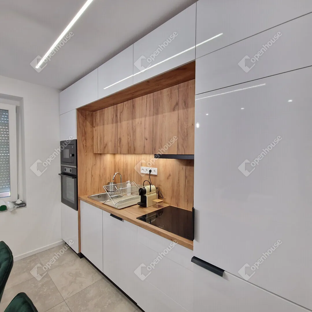 Az új konyhabútorba beépítésre került hűtőszekrény-fagyasztóval, mosogatógép, elektromos főzőlap, sütő, mikro.