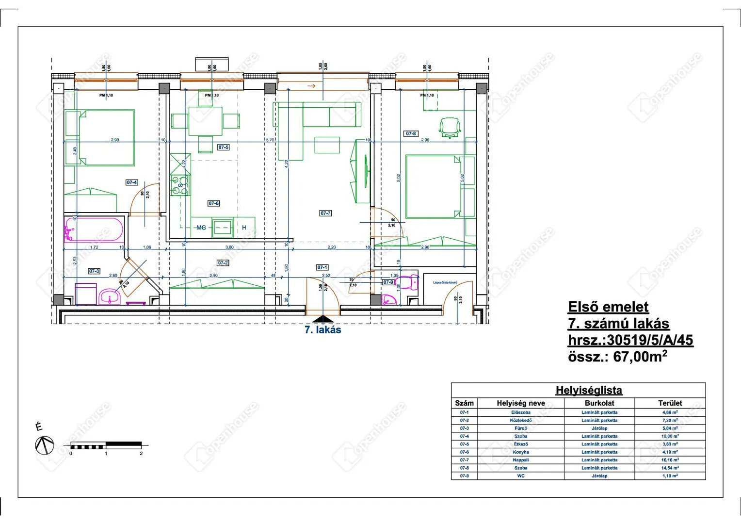 Nyílászárók: 6 légkamrás műanyag tokszerkezetű, 3 rétegű hőszigetelő üvegezéssel, rejtett redőnytok előkészítéssel.