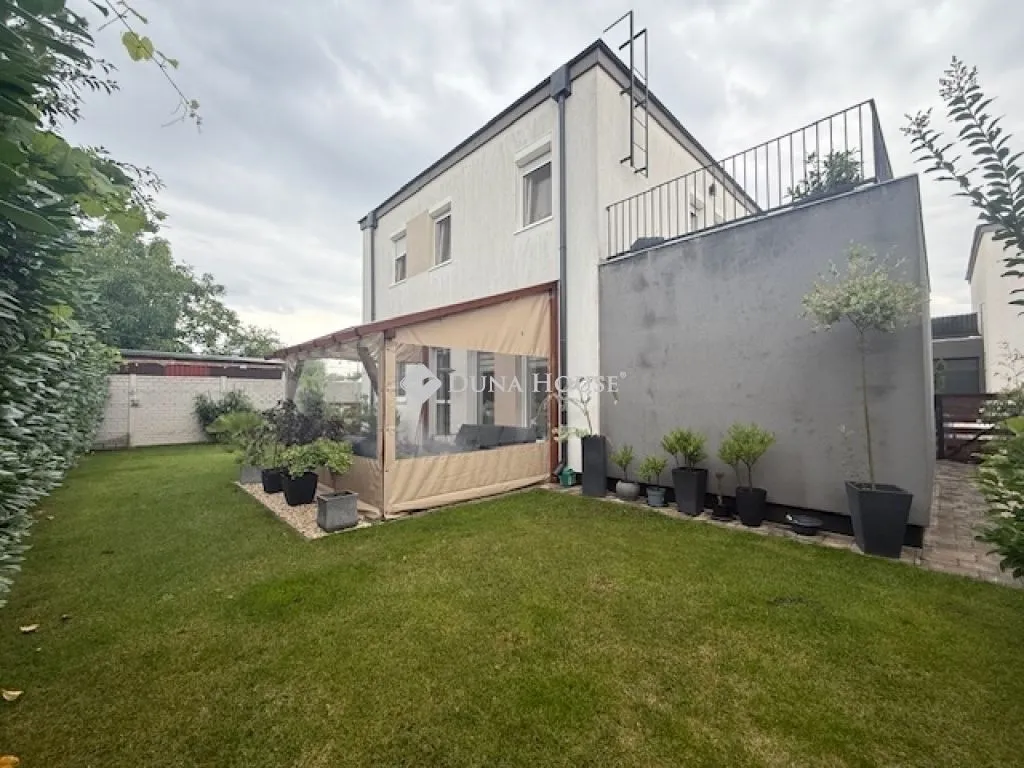 Vecsés egyik közkedvelt zárt lakóparkjában kínálom megvételre ezt a csodaszép ékszerdobozt , melybe valóban csak költözni kell !!!A Market Centrálhoz közel kínálom megvételre ezt a 131 nm alapterülettel rendelkező ingatlant a hozzá tartozó 263 nm kerttel. Az épület 2020-ban épült , Porotherm 30 as K téglából, rajta 10 cm grafit szigetelléssel és fehér nemesvakolat záróréteggel ellátva. Az ingatlan kialakítása a következő: Az ingatlan alap területe 54 nm mely 2 szinten összesen 96 nm lakóteret biztosít.Ezen felül van egy nyitott terasz mely 19,5 nm és egy 15,35 nm alapterületű garázs is mely a lakáshoz tartozik. NINCS KÖZÖS FAL EGYIK INGATLANNAL SEM A LAKÓPARKABAN!!!A telek össz.: alap területe 263 nm melyből ha kivesszük a lakó épületet, a fent maradó 180 nm saját kertként funkcionál. A képeken jól kivehető, hogy körbejárható az ingatlan , melynek a kert része gyönyörűen füvesített. A kertben található egy kisebb terasz mely télen is kifogástalanul használható , mert ponyvával téliesítette a tulajdonos. Az ingatlan korszerű , minden a mostani építési szabályzatnak megfelelően épült fel, mindez gyönyörű kivitelezésben. A lakásban kivétel nélkül minőségi és Prémium anyagok kerültek beszerelésre. Ez magába foglalja a burkolatokat , szanitereket, beltéri ajtókat és mindent ami kielégítheti az igényesség fogalmát !A nyílászárók részben elektromos, részben mechanikus redőnnyel + szúnyoghálóval felszereltek! Az ingatlanban található az alsó szinten -Amerikai konyhás nappali-Étkező-Előtér-Fürdőszoba épített zuhannyal -LépcsőtérEmeleten -3 db szoba -fürdőszoba káddal ellátva -Közlekedő -Hatalmas nyitott terasz Ezen felül az épület bal oldalában egy elektromos kapunyitással rendelkező zárt garázs !A lakás fűtéséről és melegvíz ellátásáról , gáz cirkó gondoskodik padlón keresztül történő hőleadással. A fürdőszobákban + törölköző szárítók lettek felszerelve. A kertben automata öntöző rendszer van. Az ingatlan a képeken látható berendezett állapotban kerül értékesítésre , így ide valóban csak a bőröndöt kell behúzni a vásárlás után :)Amennyiben hirdetésem felkeltette érdeklődését , keressen bizalommal és nézzük meg együtt ezt a remek ingatlant !