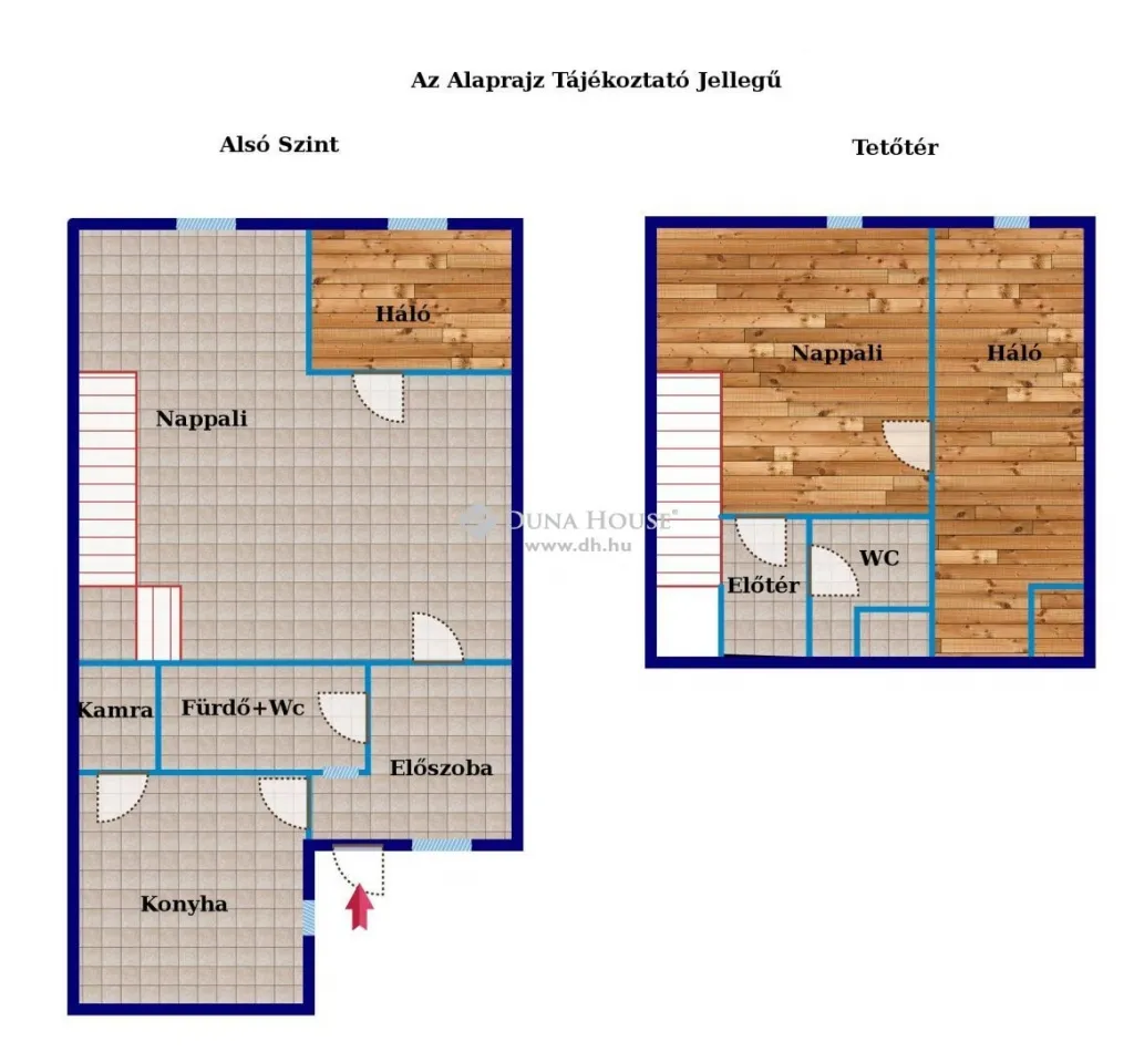 Az alsó szinten az előszobába érkezünk, innen balra a konyha és a kamra, jobbra haladva a fürdőszobát és a nappali bejáratát találjuk.