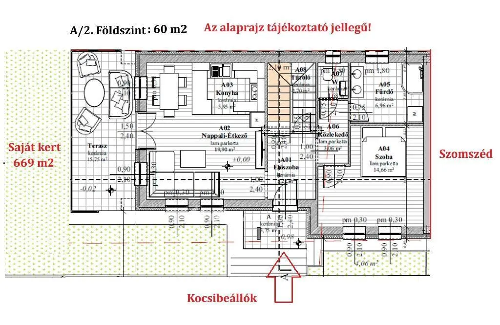 Az ingatlanhoz egy 16 m2-es terasz is tartozik, amely közvetlen kapcsolatot biztosít a tágas kerttel, mely tökéletes helyszín pihenésre, családi programokra.