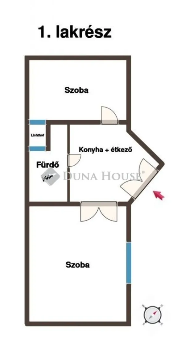 Az ingatlan két különálló lakrészből áll, melyek 53 és 23 nm alapterületűek és egy helyrajzi számon vannak, így jogilag teljesen rendezett és hitelezhető, a bejárat előtt egy 22 nm-es nyitott terasz található.