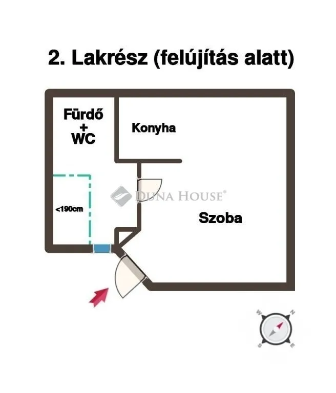 A 23 nm alapterületű lakás áll egy amerikai konyhás nappaliból és egy fürdő+WC-ből. Itt jelenleg is folyamatban van a felújítás, a víz- és villanyvezetékeket már kicserélték, a burkolatok és a szaniterek vannak még hátra.
