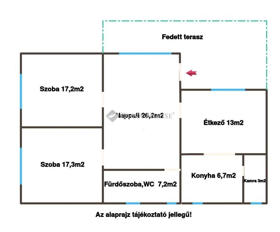 A ház 90m²-es, 2 szoba, nappali, konyha, étkező, kamra és fürdőszoba WC-vel található benne. Tágas és világos terek jellemzik, amelyek barátságos otthoni hangulatot árasztanak.