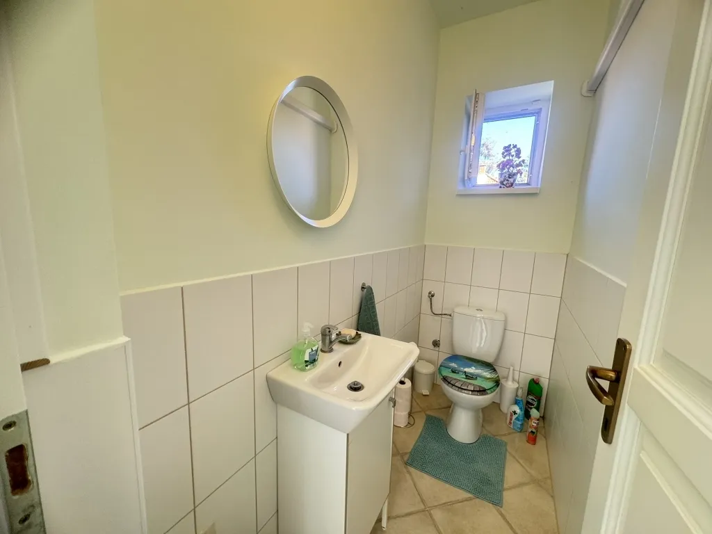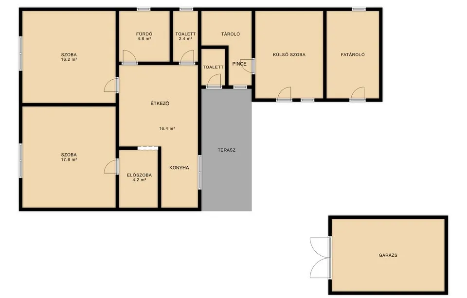 Helyiségek: előszoba, két szoba, konyha - étkező, fürdő és toalett külön. Tágas terasz. Melléképület is van, külső szoba / iroda, toalett, fáskamra. Nem utolsó sorban garázs.