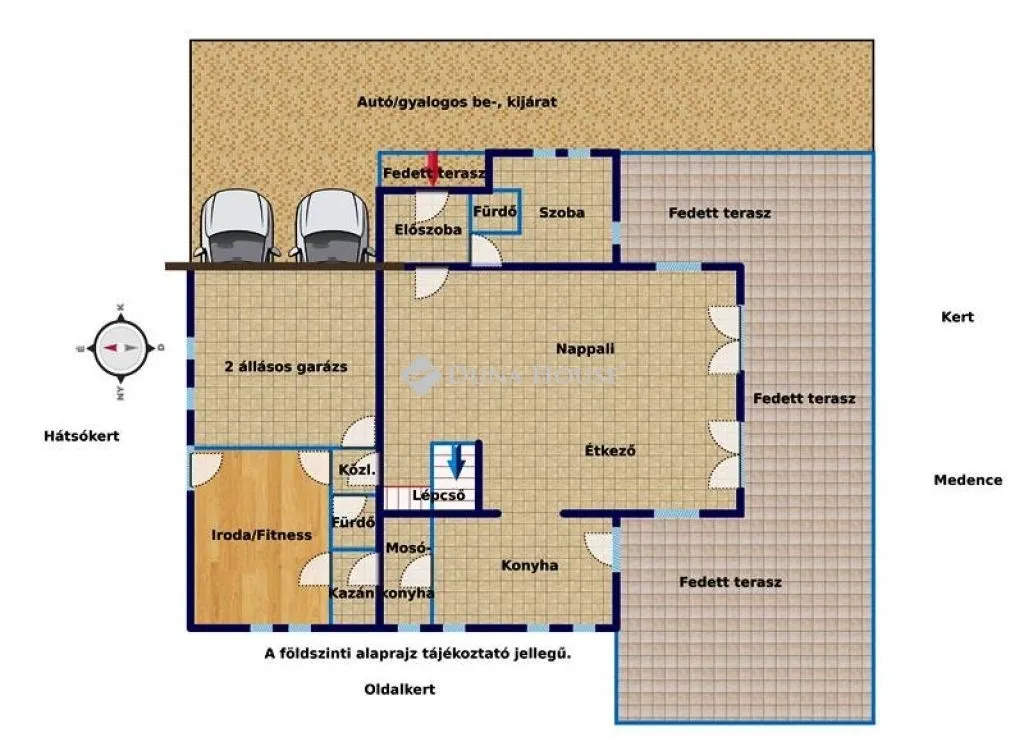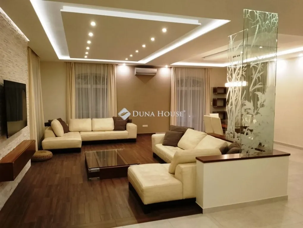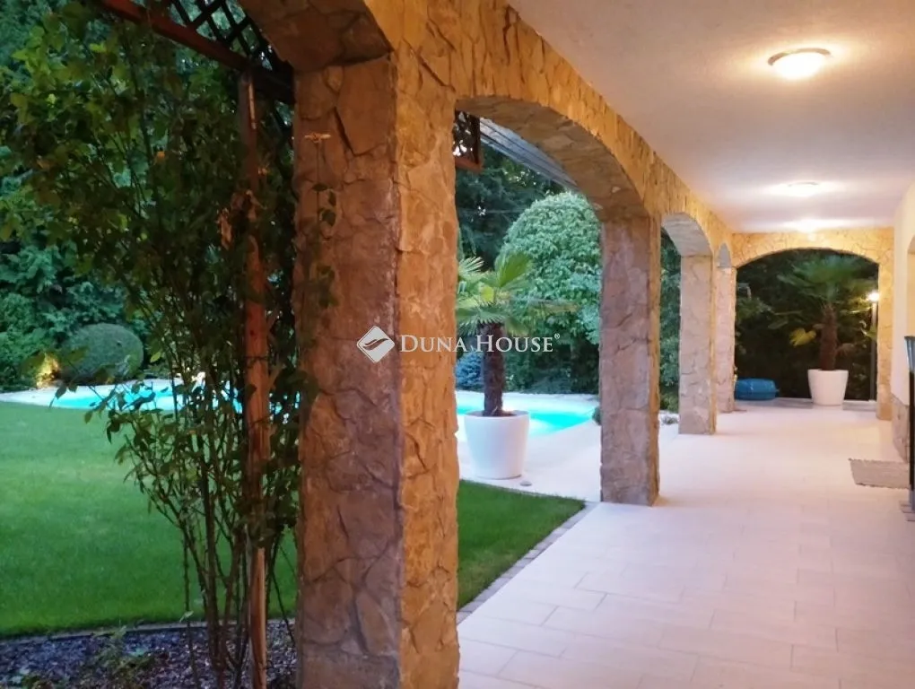 Mediterrán stílusú, igényesen kivitelezett és berendezett 2 szintes családi ház Göd Dunához közeli, lakó-pihenő övezetében!Az 1163 m2-es telken lévő, gondozott kerttel, örökzöldekkel, fákkal, medencével ölelt, 426 m2-es, 7 szobás ház 2013-ban nyerte el jelenlegi formáját. A kiváló elosztás gondos tervezői munka eredménye, fő szempont az élhető terek kialakítása és a praktikus helykihasználás, melyhez magas minőségű kivitelezés társult.A déli fekvésű, körbe napozott ház a telek utcától hátrébb eső részén található, földszinti, emeleti helyiségei, teraszai a szemnek gyönyörködtető hatalmas, ápolt kertre, a 12 méter hosszú medencére tájoltak. A telek fekvése, az épület elhelyezése kapcsán mind a kert, mind a ház tökéletes privát szférát nyújt az itt lakók számára!A közel 310 m2-es földszinti részből 100 m2 az árkádos, fedett terasz, mely közvetlen kapcsolatot biztosít a 91 m2-es nappali-étkező, a 20 m2-es konyha és a kert, a fűthető medence között, kiváló színtereket nyújtva a társasági, családi élet számára. A hatalmas nappali-étkezőt a kényelem, a jól megválasztott, színek, formák, anyagok jellemzik. A konyha sütő-főző szigettel, Miele konyhagépekkel,nagy felületű gránit pultokkal felszerelt. Északi oldala felé háztartási, gépészeti (kazán) helyiségek és egy 26 m2-es fitness terem van, mely akár szobaként, irodaként is használható, külön ajtó nyílik innen a hátsó kertbe és kis fürdő is kapcsolódik hozzá. Az épület fő bejáratai a keleti oldalon találhatók, a gyalogosan érkezők a fedett teraszon, előszobán, az autóval érkezők pedig a 2 állásos, 36 m2-es garázson keresztül juthatnak a nappali-étkezőbe. A garázshoz vezető térkő burkolat kifut az automata kapu bejáratig. A gyalogos bejárat mellett egy 12 m2-es vendégszoba is helyet kapott, külön zuhanyzóval, WC-vel, kézmosóval.A 190 m2-es emeleti szintre a nappali-étkezőből tudunk felmenni, kényelmes falépcsőn. 154 m2-es, 2,50-es belmagasságú lakótér és 2 db nyitott terasz található itt, melyek a tágas közlekedő által szeparáltak. A déli oldal 32 m2-es, akár ketté is választható szobájához 18 m2-es, gyönyörű panorámás terasz, míg a nyugati oldal 23 m2-es szobájához gardrób is kapcsolódik. A lépcsőfeljárótól balra egy 27 m2-es, minden kényelemmel (masszázs kád, zuhany, 2 állásos mosdó, elektromos szauna) felszerelt fürdőszoba kapott helyet, de a keleti oldalon is van még egy 10 m-es fürdő, a mellette lévő 19 és 10 m2-es szobák igényeinek kielégítése céljából. A közlekedőből közvetlenül tudunk kijutni az északi/keleti oldalon lévő 19 m2-es teraszra.A 38-as külső tégla falaknak, monolit vasbeton födémszerkezetnek, a külső, belső hőszigeteléseknek, a nyílászáróknak, tömör fa beltéri ajtóknak, árkádos terasz kialakításnak köszönhetően a ház energetikailag korszerű, nyáron is kellemes hőmérsékletű, amelyet teljessé a légkondicionált helyiségek biztosítanak. Az ingatlan melegét korszerű szabályozással ellátott fűtési rendszer (Vitodens 200 kazán 300 l-es puffertartállyal) szolgáltatja, földszinten padlófűtéssel, emeleten radiátorokkal. A 60 m3-es, vízgépészettel ellátott medence igény szerint fűthető a kazán által. A garázsban nagy teljesítményű elektromos csatlakozó van kiépítve elektromos autó töltéséhez. A ház biztonságát távfelügyelethez bekötött riasztó garantálja. A gondozott növényzet öntözését automata locsolórendszer biztosítja. A kertben található még egy praktikus faház a kerti szerszámok tárolására, valamint egy fűthető üvegház is.Az ingatlan a meglévő bútorozottsággal, felszereltséggel eladó.Az elhelyezkedés kiváló azoknak, akik a nyüzsgéstől távolabb, úgy szeretnének élni, mintha minden nap nyaralnának, hiszen a Duna part pár lépés. Az M2-es autópálya 10 percen belül megközelíthető, ahonnan Budapest belvárosa 20 perc.Az ingatlan készen arra, hogy élettel töltsék meg! Jöjjön el, nézze meg és legyen az Öné!