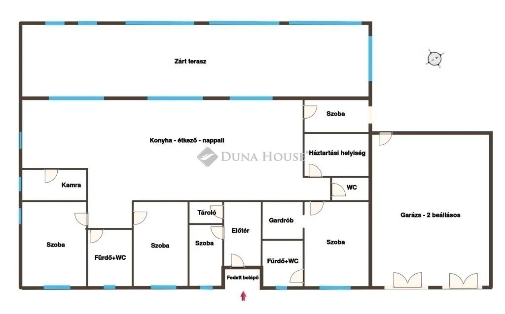 Terasz: fedett, zárt, 66,5 m²-es, télikert jellegű, közvetlen kertkapcsolattal, hőszigetelt teraszajtókkal