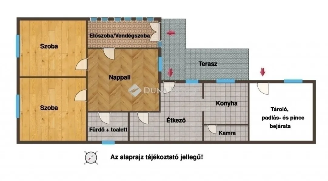 A házba két külön bejáraton is bejuthatunk: a nagyobb előszoba jelenleg vendégszobaként funkcionál, a másik bejárat pedig az étkezőbe vezet.