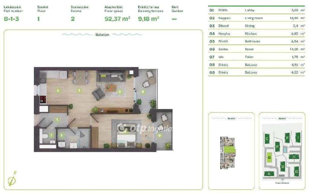 Balaton Déli part, Balatonszemes, közvetlen vízparti, 57 m2 lakás eladó. Az ingatlan a Balaton egyik legszebb vízparti lakóparkjában, természetes zöld környezetben található. A környezettudatosan épült, panorámás kilátást nyújtó, modern épületek esztétikailag és a fenntarthatóság szempontjából is kiemelkedőek, egyszerre biztosítják a kényelmes otthont és a balatoni életstílust. A különböző lakástípusok lehetőséget adnak arra, hogy minden lakó megtalálja a számára tökéletes otthont, akár az Otthon Start Hitelprogram keretében is. A földszinti lakások terasszal és kertkapcsolattal rendelkeznek, az épületek felső emeletén penthouse lakás került kialakításra. Ehhez az 52 m2-es 1. emeleti lakáshoz kis tároló és két, összesen 9 m2 erkély tartozik. A lakópark nem csak elhelyezkedése miatt egyedi, minden egyes lakás a legújabb intelligens technológiával, magas minőségű és igényes alapanyagokkal, prémium extrákkal kerül kialakításra. Egyszerre komfortosak és energiahatékonyak: elektromos redőnyök, szúnyogháló, egyedileg vezérelhető hőszivattyús, fan-coilos hűtési és fűtési rendszer, okosotthon rendszer, beléptető rendszer, riasztórendszer. Az ingatlan értékét növelik a következő szolgáltatások: a területen kialakított gondnoki, üzemeltetési iroda; zöldterületbe illesztett játszótér; zárt, privát vízpart több, mint 130 méteren; partmenti stég; közel 120 m2 vízfelületű strandmedence 16 m2-es gyermekpancsolóval; automata öntözőhálózat a lakóépületek közötti zöldfelületek öntözésére. OTP Ingatlanpont és Pénzügyi Pont irodánk teljeskörű támogatást nyújt az ingatlan kiválasztásával, megvételével, biztosításával és finanszírozásával, akár egyedi kedvezményes hitelekkel, befektetési lehetőségekkel kapcsolatban is. Bővebb információért keressen telefonon! M316169