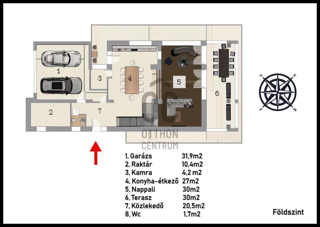 - Földszint felosztása: 40 m2-es teraszos nappali, 27 m2-es étkezős konyha, kézmosós wc, előtér és közlekedő 20 m2, raktár 10 m2.