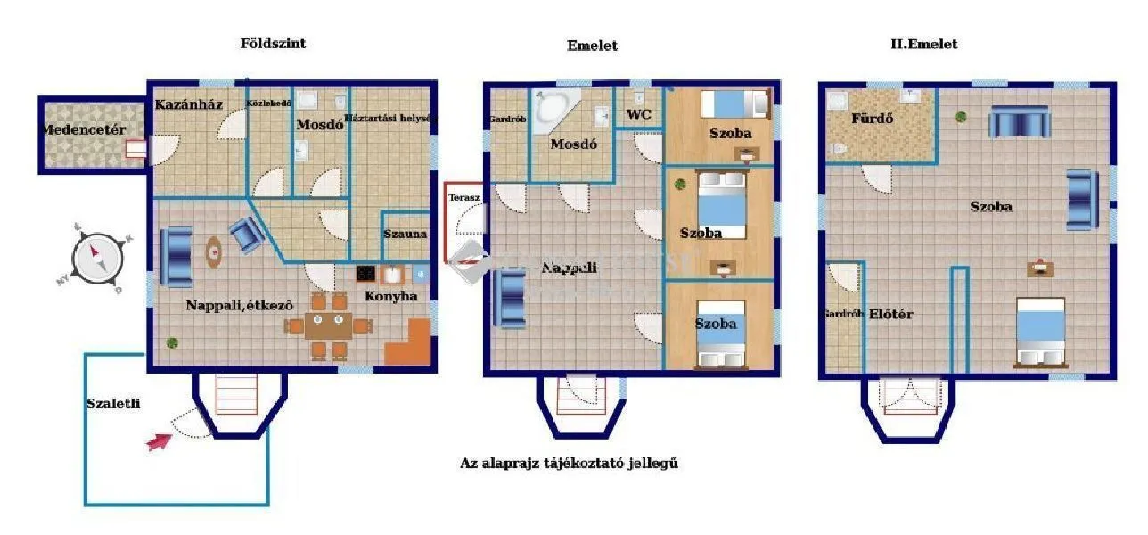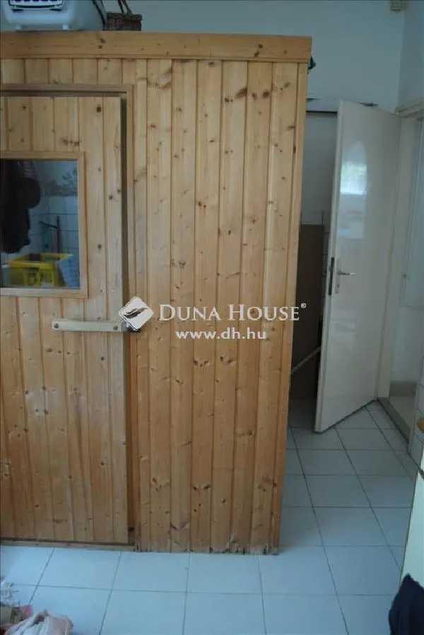 Innen balra nyílik a földszinti, fél-szuterén elhelyezkedésű amerikai konyhás nappali, a konyhából pedig a hátsó helyiségekbe haladhatunk tovább: mosókonyha, szauna, fürdőszoba, kazánház. A kazánházból jutunk a fedett medence térhez. A medence és gépészete részlegesen működőképes, felújítása már az új tulajdonosra marad ugyanígy a földszinti bejárat előtt található szaletli tető.
